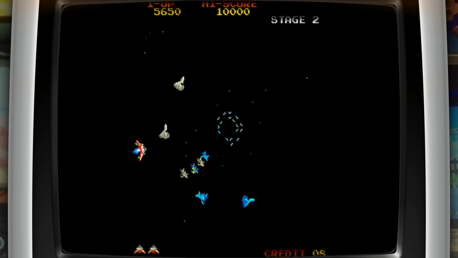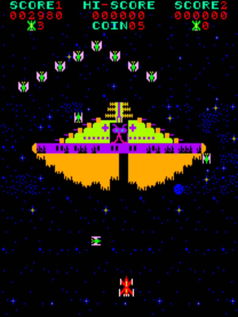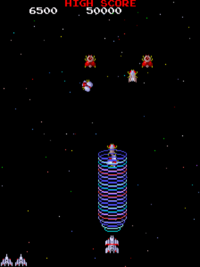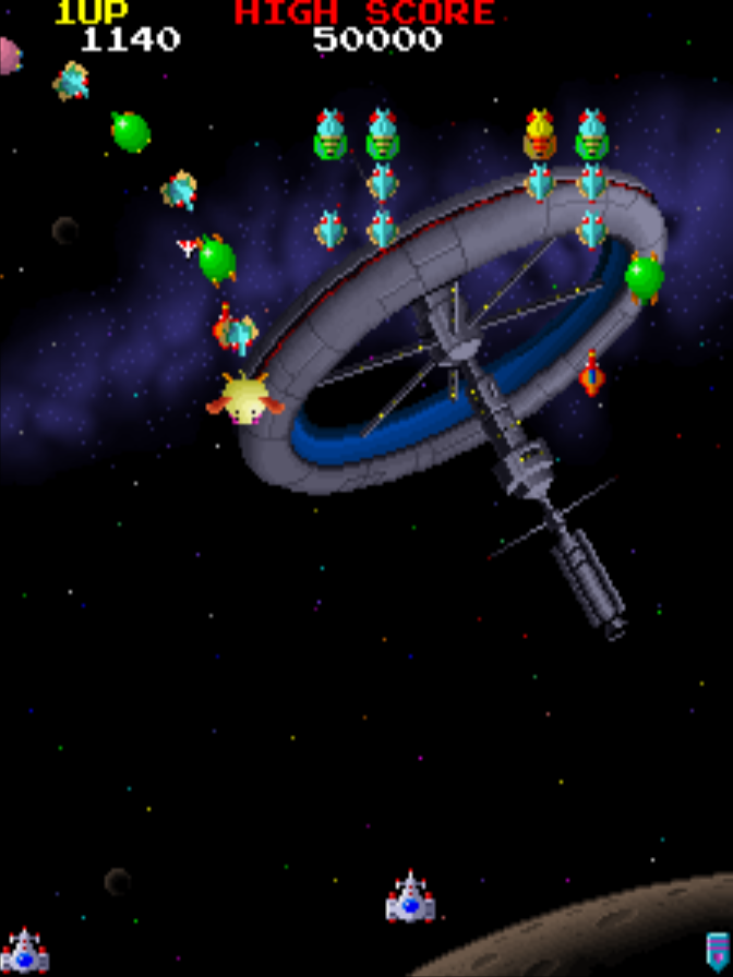 Je ne vous apprend peut être rien mais les premiers Shmups étaient des jeux développés exclusivement sur les bornes d'arcade avec déplacement horizontal et en écran fixe. Cela commence de façon très dépouillée avec l'écran noir et la mollesse des déplacements des mutants de Space Invaders (1978) chez Taito. Son meilleur clone Galaxian (1979) pour Namco, rajoute un petit écran avec quelques étoiles mobiles. Votre vaisseau ne peut se déplacer que de gauche à droite la plupart du temps, le décor restant figé. Le genre trouvera son champion avec Galaga (1984) digne suite de Galaxian pour Namco et qui introduit le principe de boss de fin de niveau.